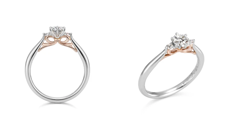 簡約卻洋溢著優雅浪漫氛圍的訂婚鑽戒,於側面低調地點綴著金色蝴蝶結別具匠心之虞,更有著象徵繫緊兩人羈絆的美好寓意。設計細節可依照個人需求喜好變更金屬或寶石進行創意改造。