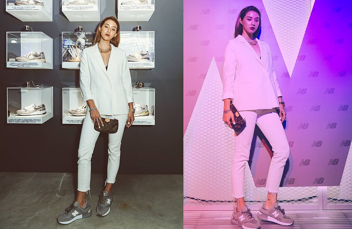 Angelina以全白中性西裝搭配NB經典灰鞋,帥出宇宙超強氣場!