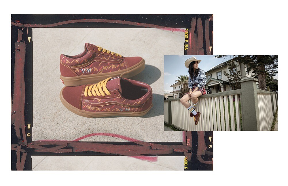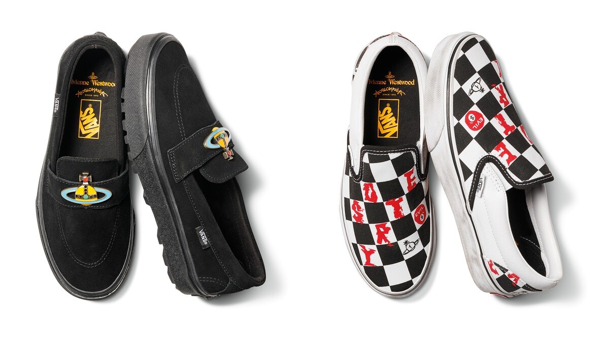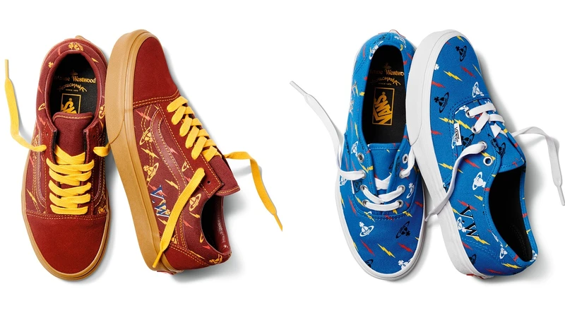 將1977年首次曝光的「DESTROY」圖案呈現於Slip-On鞋款上,並以星球圖案及EVIL字樣點綴。選自於90年代的鞋型Style #53,則縫上Vivienne Westwood經典Logo。Old Skool鞋款以古典啞紅色呈現,鞋側邊加入Vivienne Westwood經典圖案。而元祖Authentic鞋款在鞋側印上品牌縮寫「VW」字體。