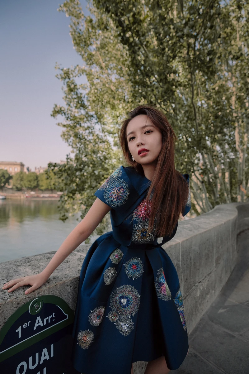 第一套是洋裝。一眼看上去就像將煙火穿在了身上,也確實是我鍾情愛這件單品的原因。煙火向來給人絢麗華美的感覺,但絢爛的火光在綻放的下一秒就消逝在黑暗之中。Dice Kayke這套洋裝卻將煙火最美麗的時刻永久地保存下來。深藍色有如我們抬頭觀望煙花的沉靜夜色,再運用了品牌卓越刺繡工藝手法,一針一線的將璀璨煙火的真實樣貌複製到布料上,呈現出奪目迷人的美麗姿態。