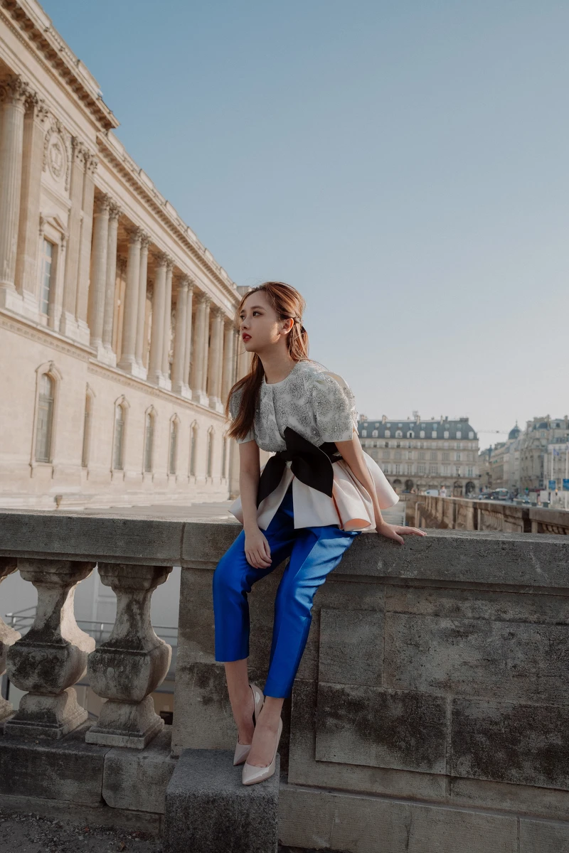 比起較為正式優雅的小洋裝款式,第二套我則是挑選了可正式、可休閒的裙襬小上衣。這款上衣完整地展現出了品牌兩大經典特色:浮誇裙襬與大蝴蝶結。服裝本身縫製上了許多精緻珠繡,更讓衣裳增添了一抹奢華感;下身則搭配緞面材質的寶藍色長褲,希望讓整體造型有著亮眼卻不過於搶眼的視覺效果,適當的將大膽設計與優雅質感同時保留,在任何場合中都可以因此脫穎而出。