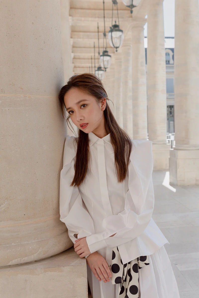 最後一套則是非常適合辦公室、洽談公務、平時上班…時著用的好感時尚選擇,色調上回歸乾淨簡潔的經典基本路線,Dice Kayek以獨到的剪裁作為視覺上的突破,將當紅的寬肩、品牌經典蓬蓬袖結合,更在下擺處融入常見的裙襬設計,讓整款襯衫跳脫了無趣框架,配上一抹黑白圓點的蝴蝶結緞帶點綴,俐落有型卻又有著歐洲女仕的優雅柔美風格。下身著用的裙子亮點則是在白底黑點的緞面蝴蝶結上,絲質緞面柔軟材質讓蝴蝶結隨著重力自然下墜,無疑成為這套服裝造型的最佳點綴。