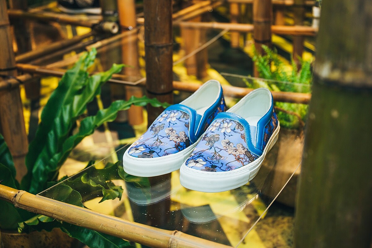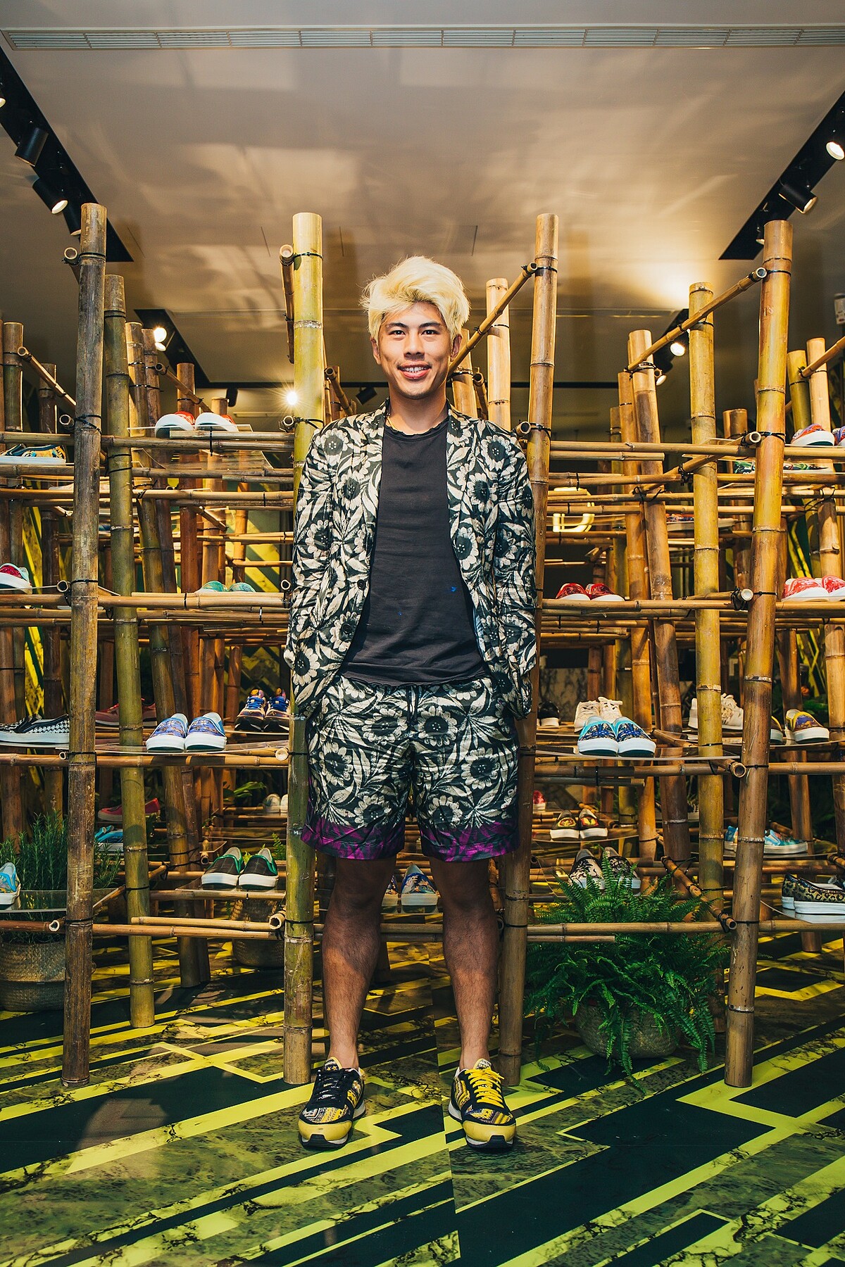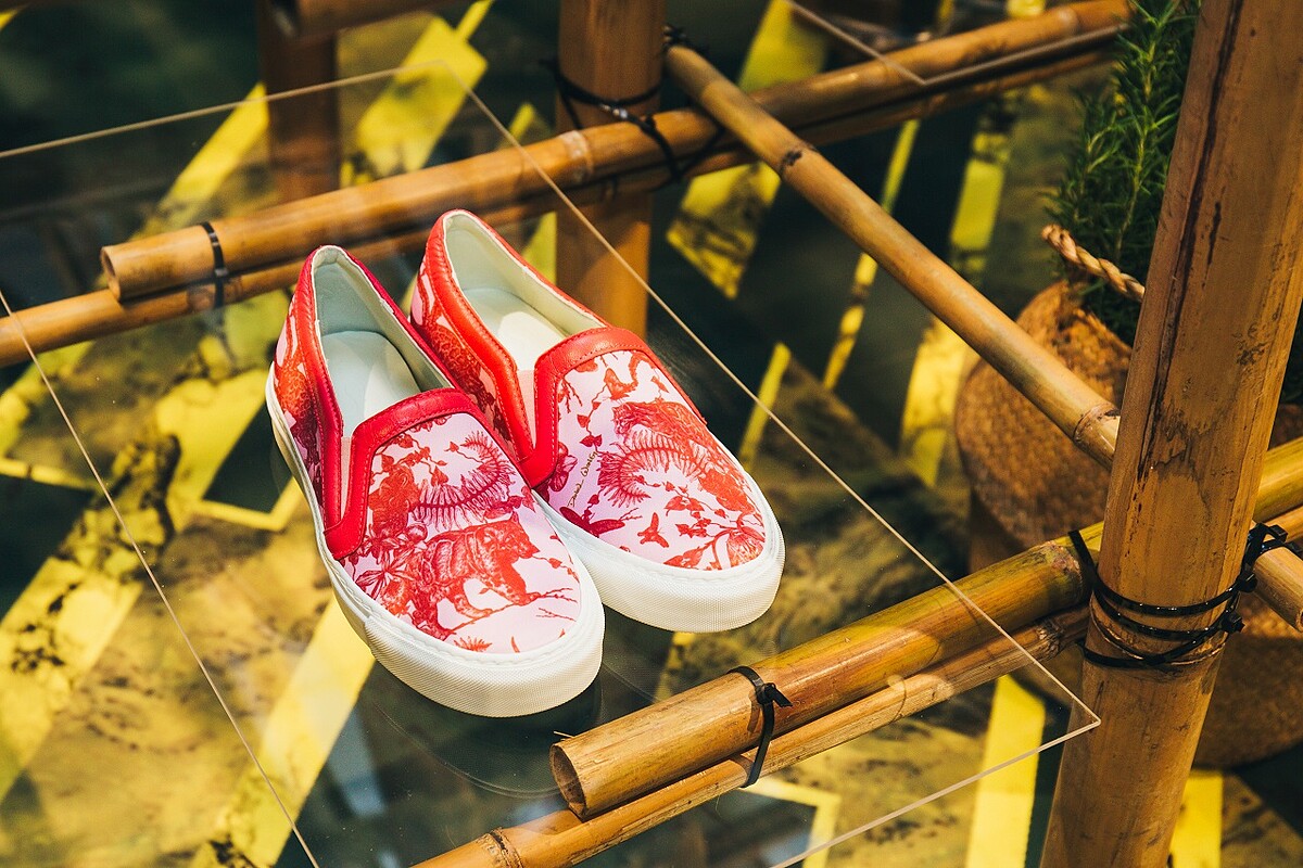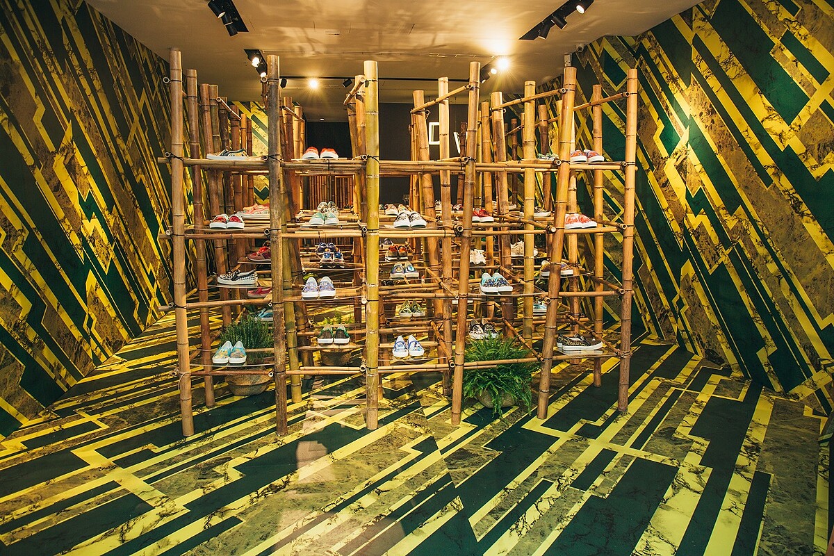 Daniel Wong擁有強大的心智與靈魂,五年前成為世界的探索者出發,其品牌Logo指南針別具意義,使探索者在旅途中引領方向。在品牌即將邁入五周年之際,將概念店打造全新裝置藝術,以竹子搭起圍籬,錯綜複雜間有著品牌經典印花鞋款;竹亦為足,重返品牌精神,在繁忙庸碌生活中駐足,探索更多美好細節。