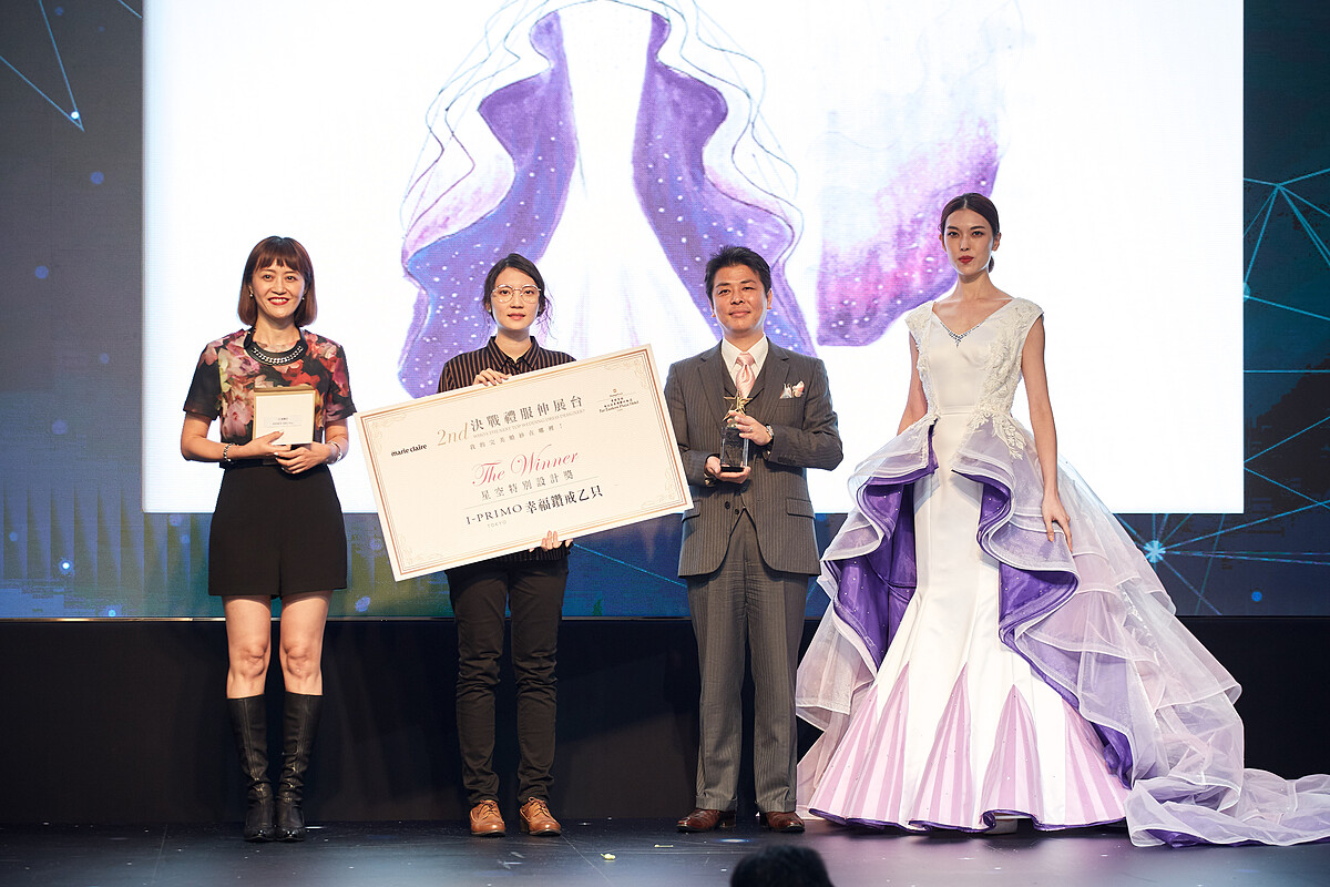 今年加碼的I-PRIMO 星空特別設計獎由蘇蘭若設計師獲得,別緻的紫色裙擺設計,讓評審眼睛一亮,是少數入圍作品中,用色非常大膽的一件作品「以銀河為靈感來源,大大小小數以萬計的星星聚集而成,象徵相愛的兩人累積無數回憶,攜手永恆」