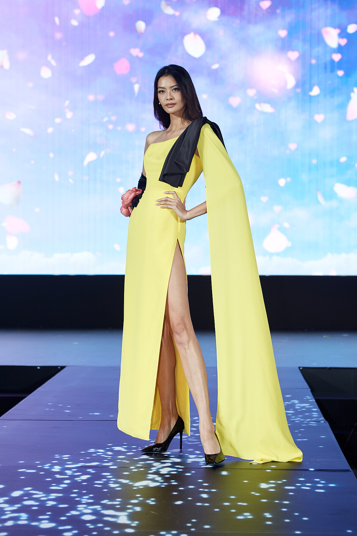 而林嘉綺的禮服為柔軟的沙典綢緞,利用布的垂墜度俐落剪裁,加上鮮豔飽滿的黃色面料,完全呈現了霸氣時尚。