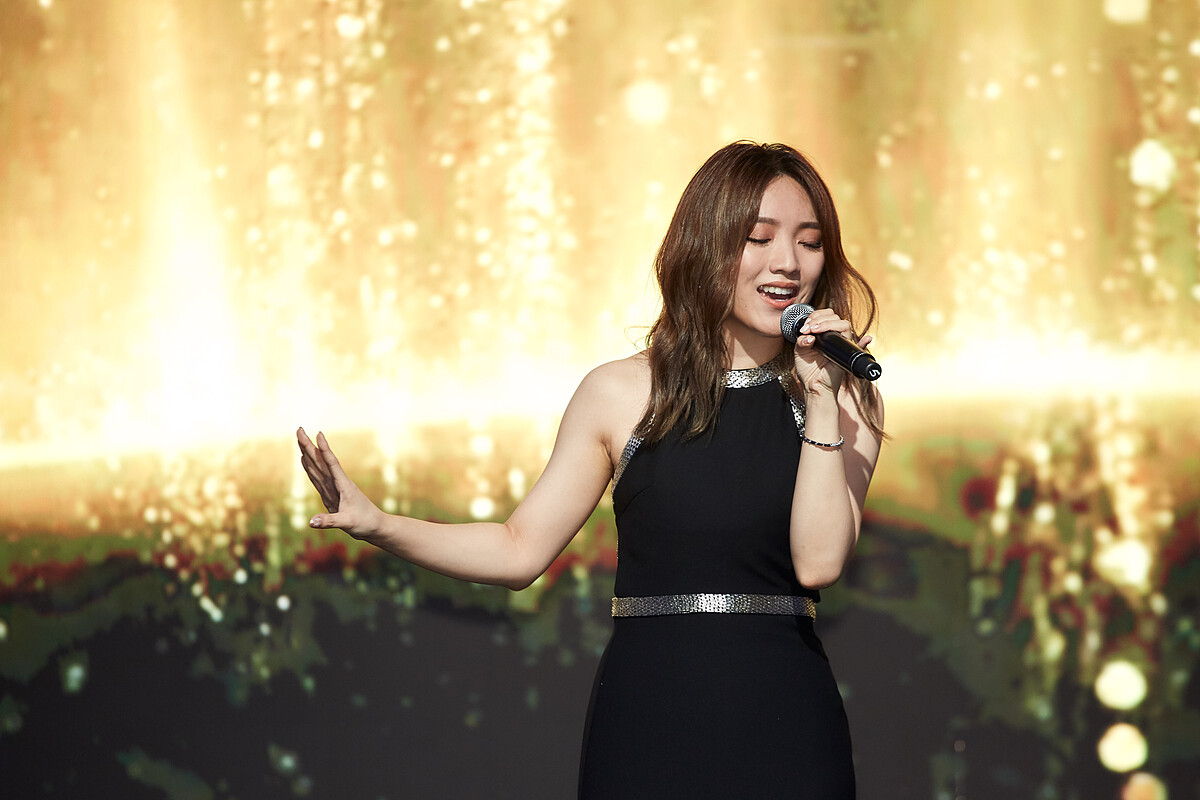 壓軸邀請到美聲歌姬「閻奕格」,身穿柔累多布料材質削肩禮服,於現場帶來三首幸福組曲,給貴賓一個難忘聽覺饗宴!閻奕格表示:「從小就夢幻穿上婚紗步入禮堂,此次穿著林薇老師的禮服,非常美且典雅,感覺很幸福,也希望自己可以趕快找到另一半,穿美美的婚紗步入禮堂!能參與今晚的盛典非常榮幸,是場非常有意義的公益活動!」
