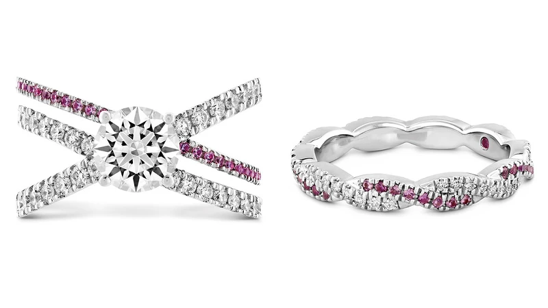 Sloane Silhouette戒指 (白K金 鑽石、粉紅剛玉、主鑽);Sloane Picot All In A Row戒指 (白K金,鑽石、粉紅剛玉)。