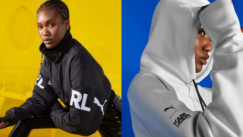 以高級訂製服概念出發,延續卡爾獨鍾的優雅黑白純色美學及時尚前衛風格,透過不規則拉鍊配件、滿版色塊拼接、極具巧思的細節設計,玩轉PUMA高調強勢的品牌LOGO,推出服裝、配件、球鞋等一系列時髦單品。