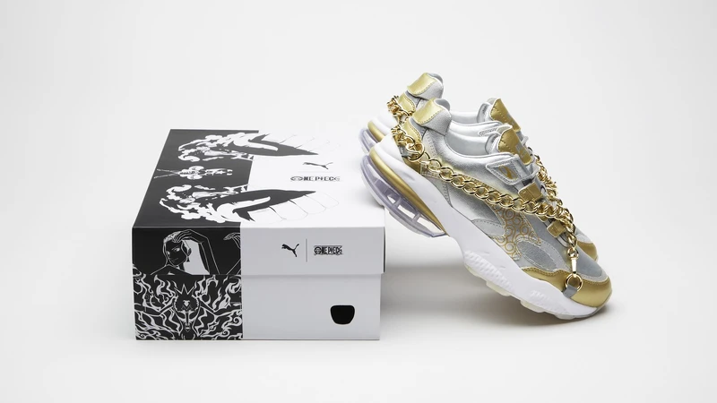 PUMA CELL VENOM聯名鞋款披上金黃色的寶藏外衣,鞋面使用金銀配色彰顯奢華富貴,兩側以魯夫的草帽圖騰做點綴,且加入金鍊交叉串接鞋頭及鞋跟,附上金鑰匙墜飾,將整雙鞋款化身珍貴寶藏,同時也有向航海王20週年致敬的意味。