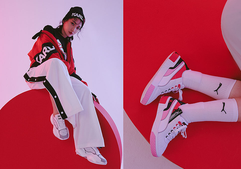 除了服裝超級迷人之外,被大膽翻玩的PUMA經典鞋型,就真的每一雙都是時髦精的天菜,無論是充滿80年代復古風格、存在感強烈視覺設計的PUMA ROMA ARMOR by KARL、白系搭配LOGO印花,優雅時髦兼具的厚底PUMA ALTERATION by KARL、或是融入粉色少女感又不失帥氣俐落的PUMA CALI by KARL鞋款,每一雙都挾帶著獨領風騷的氣勢迎面而來,也難怪小美自己都很難取捨,根本就是想整系列All In啊!