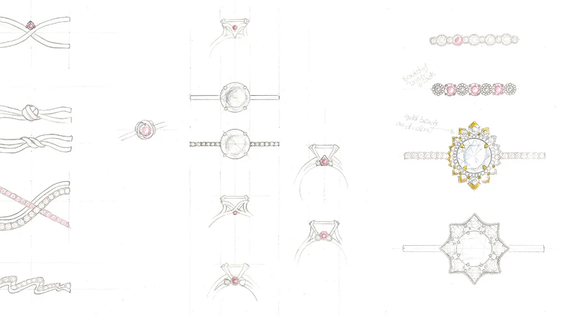 Sloane Silhouette戒指 (玫瑰金全鑽款式 鑽石、粉紅剛玉、主鑽);SLOANE Picot Floating Diamond戒指 (玫瑰金,鑽石、粉紅剛玉)。