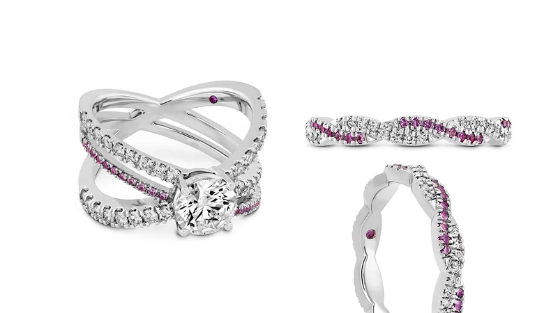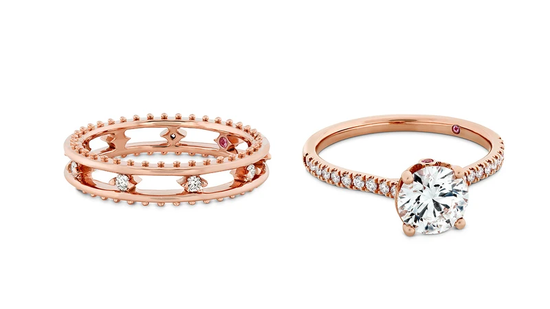 在此系列每一只戒環內都鑲嵌了一顆細緻粉色剛玉,象徵設計師Hayley Paige給予配戴者的承諾,這個美妙的巧思,也讓HEARTS ON FIRE ╳ Hayley Paige 聯名珠寶系列更顯細膩、溫暖。Hayley Paige透露,粉紅色確實是設計禮服的常用色彩,但與其說她獨鍾粉紅色,不如說她「對各種『閃亮亮』都無法抗拒!」整個系列以HEARTS ON FIRE奢華美鑽搭配白K金、玫瑰金、粉紅剛玉的華美光澤,都蘊藏設計師希望呈現給配戴者的個性主張與祝福意涵,讓女性隨心佩戴、隨性裝扮,戴上的不只是美麗珠寶,更是一種耀眼自信態度。