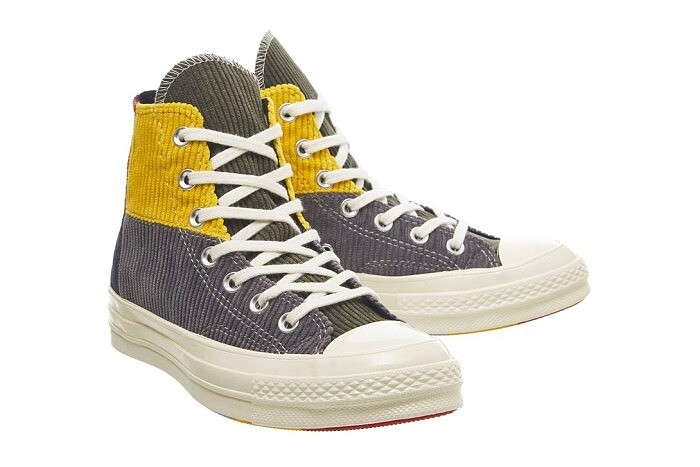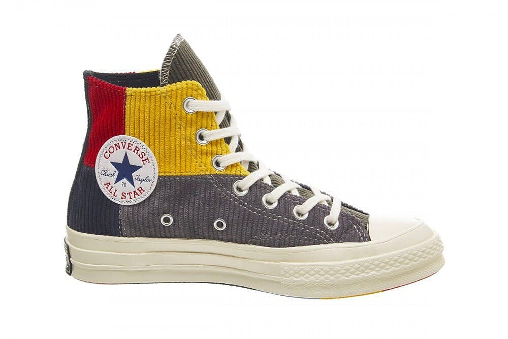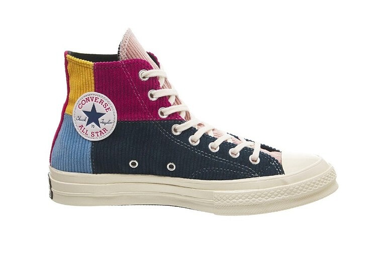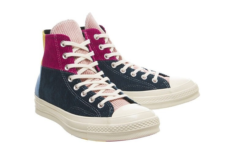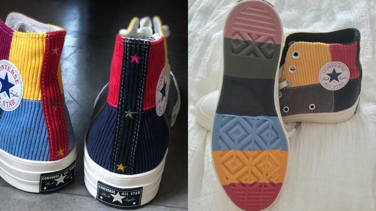 以經典鞋款Chuck 70s為基型,結合紅色、黃色、灰色、天藍、紫紅、黑色等高飽和色彩的燈芯絨布料,透過色塊拼接的手法,推出粉色鞋舌、墨綠色鞋舌2款Chuck 70s鞋款。