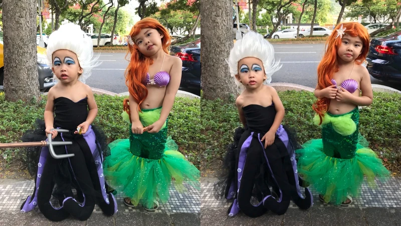 公主見怪不奇怪,但隨著反派角色魅力的崛起,這次的萬聖節也出現了不少萌小孩的反派變裝,而這對姐弟就分別扮演了《小美人魚》中的正反角色愛麗兒和烏蘇拉。不僅有著超到位的假髮和服裝,弟弟眼皮上的妝容和右下嘴唇的黑痣完全將烏蘇拉的特徵完美點出。
