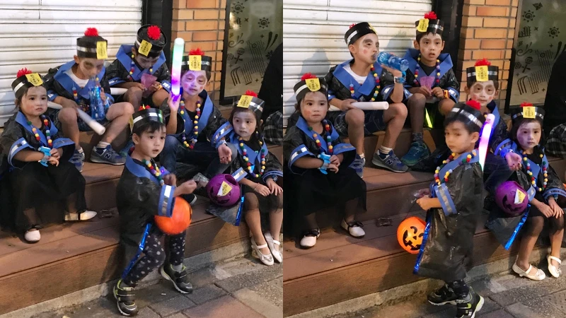 此外,編也意外捕捉到了成群結隊的小殭屍們,萌度完全破錶!然而正當編數著有幾個小殭屍的時候,一旁的媽媽們便笑著說:「其實有九個但三個先跑走了(笑)」相約一起扮成同個角色也是不錯的選擇喔!