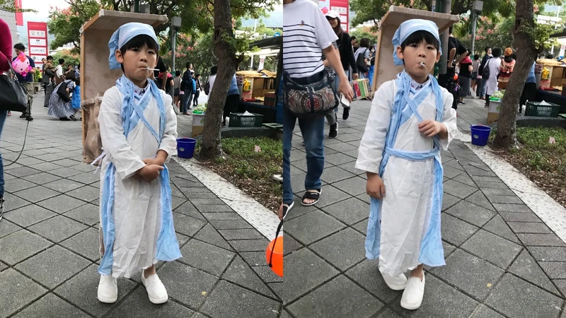 在人山人海、滿是小鬼怪的公園裡,編遠遠就看見了一個彷彿頭戴巨大安全帽的小朋友,然而走近一探,竟然是日本人氣漫畫《鬼太郎》中的眼球老爹!問起媽媽為何弟弟會想裝扮成鬼太郎,媽媽表示原先弟弟想扮演無臉鬼,但因為不願把臉塗白只好作罷,直到媽媽某日經過雜貨店看到保麗龍後突發奇想,因此可愛的眼球萌娃就此誕生了!