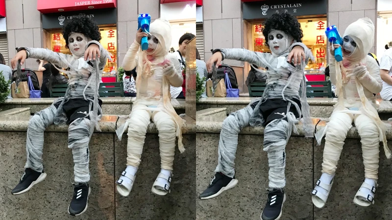 走著走著,編的目光隨著人潮的搶拍投向了兩個坐在圍牆上的小小木乃伊。從頭到腳,除了露出的可愛臉蛋和手掌之外,其餘的部分均以紗布圍裹,搭配上驚悚的妝容和超到味的姿態,也難怪這兩個木乃伊成了人群搶拍的小明星。