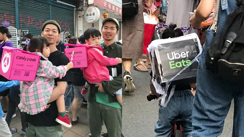 隨著科技的發達與便利,外送服務商店如Food Panda和Uber Eats早已成為許多台灣人手機中不可或缺的重要APP,街上更是處處可見外送員穿梭的身影。如今,這波風潮也吹到了萬聖節裝扮中。小小孩揹著爸媽精心改造的外送箱,好比換上“Candy Panda”名稱的後揹袋,萌度和吸睛度完全百分百!