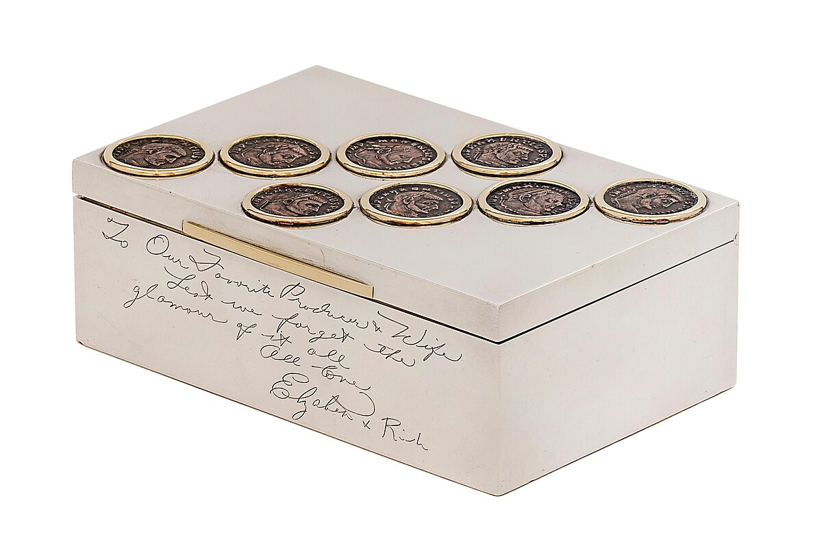 銀製菸盒,鑲嵌8枚羅馬古幣,創作時間為1962年,伊莉莎白泰勒和理查波頓訂作送給埃及豔后導演的結婚賀禮,曾經是伊莉莎白泰勒的收藏。