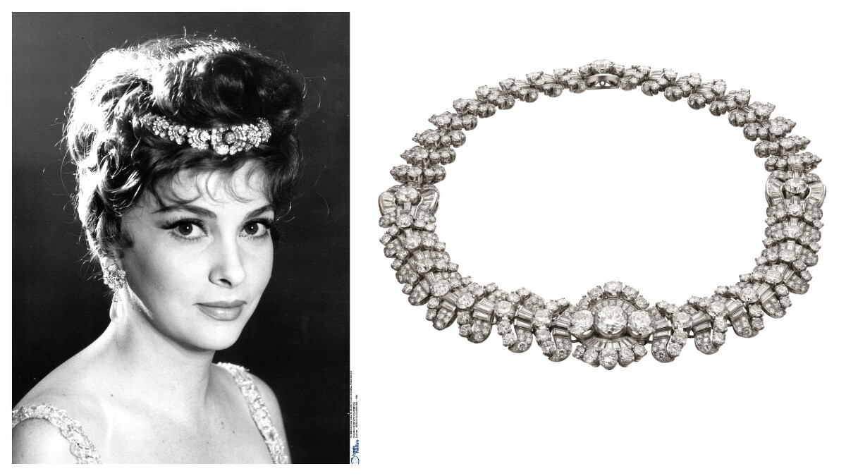 頂級鉑金項鍊,鑲嵌鑽石,項鍊亦可拆卸成兩個手鐲,創作時間約西元1955年。義大利知名女星 Gina Lollobigida 曾在1964年的電影《Woman of straw》中配戴,現為私人收藏。