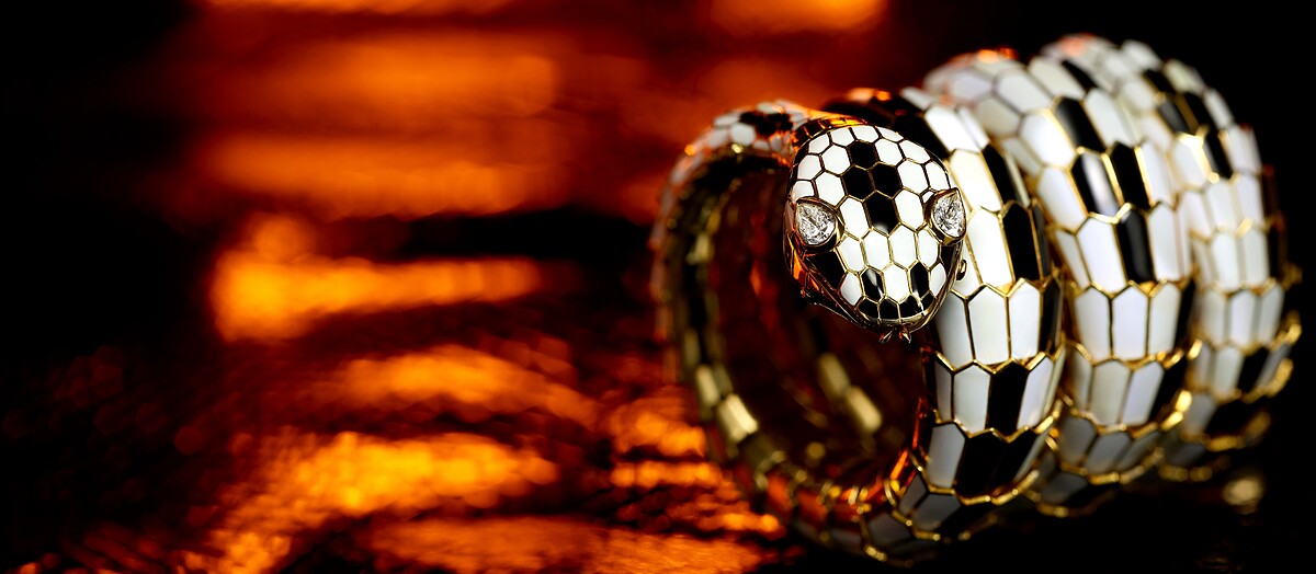 Serpenti 頂級黄K金與黑白琺瑯手鐲腕錶,鑲嵌鑽石,創作時間約西元1965年。