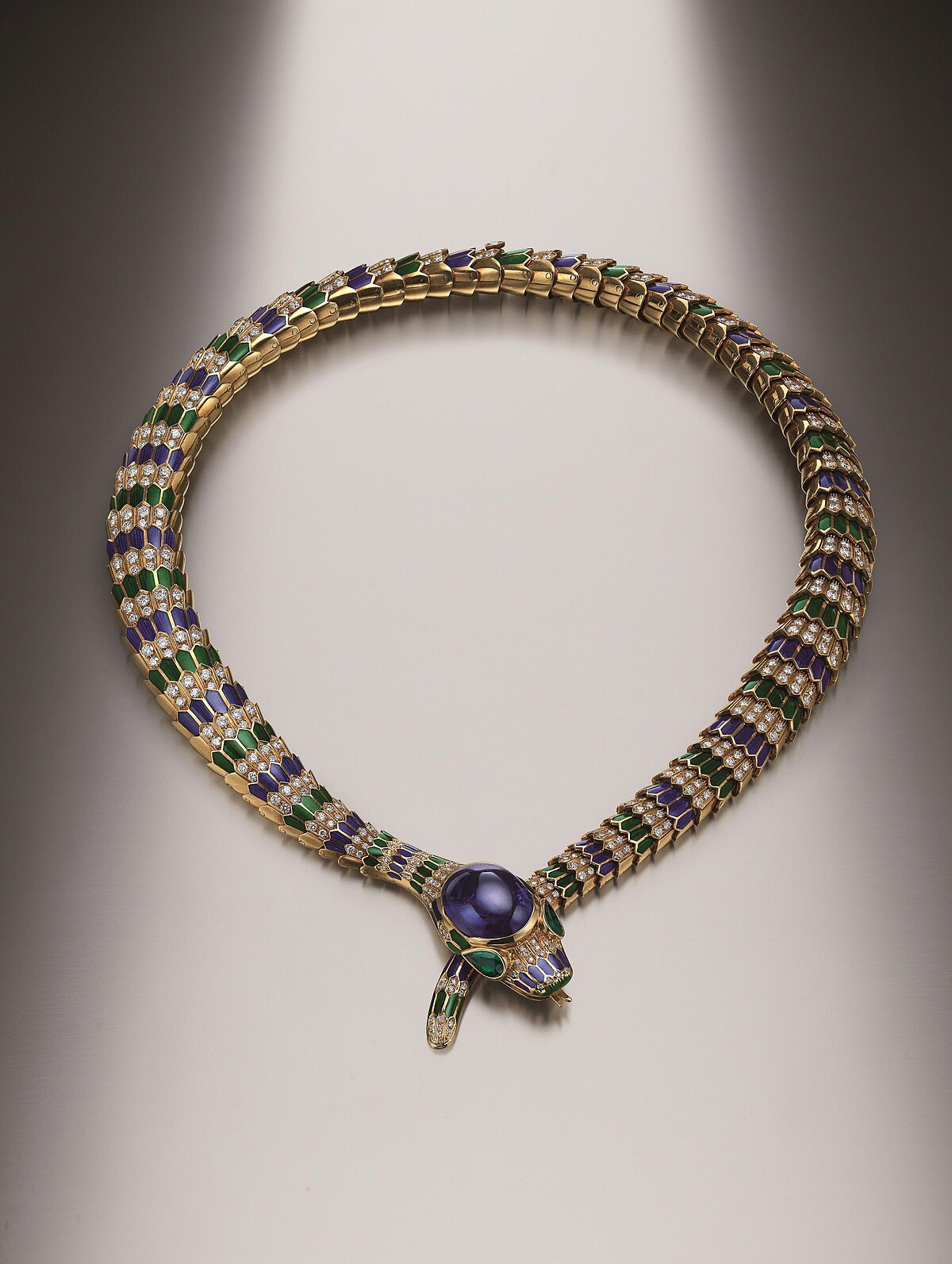 黄金彩寶項鍊,鑲嵌彩色琺瑯、藍寶石、祖母綠和鑽石,創作時間約1969年。