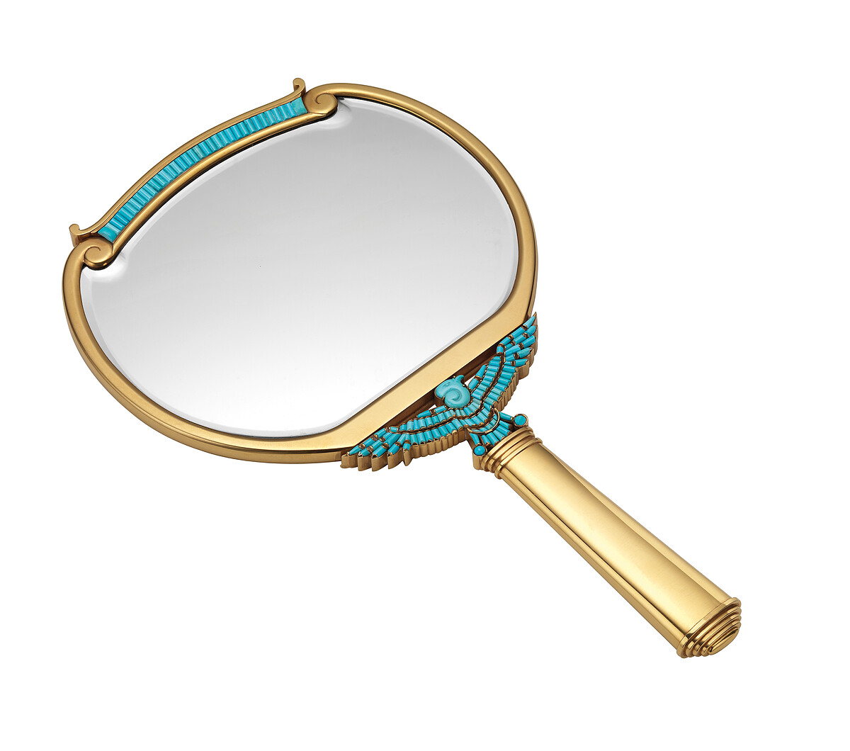 頂級黃K金手拿鏡,鑲嵌綠松石,創作時間約西元1962年,曾經是伊莉莎白泰勒的收藏。