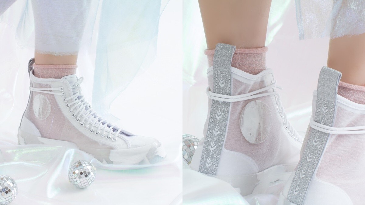 Converse X 冰雪奇緣聯名系列分別推出以一雙成人版Chuck 70鞋款,以及三雙兒童版鞋款。大人鞋款採用仙氣炸開的網紗透膚材質打造鞋身,加上隨性的潑墨細節及銀蔥點綴的鞋跟,彷彿與電影中冰晶閃亮的場景相呼應。