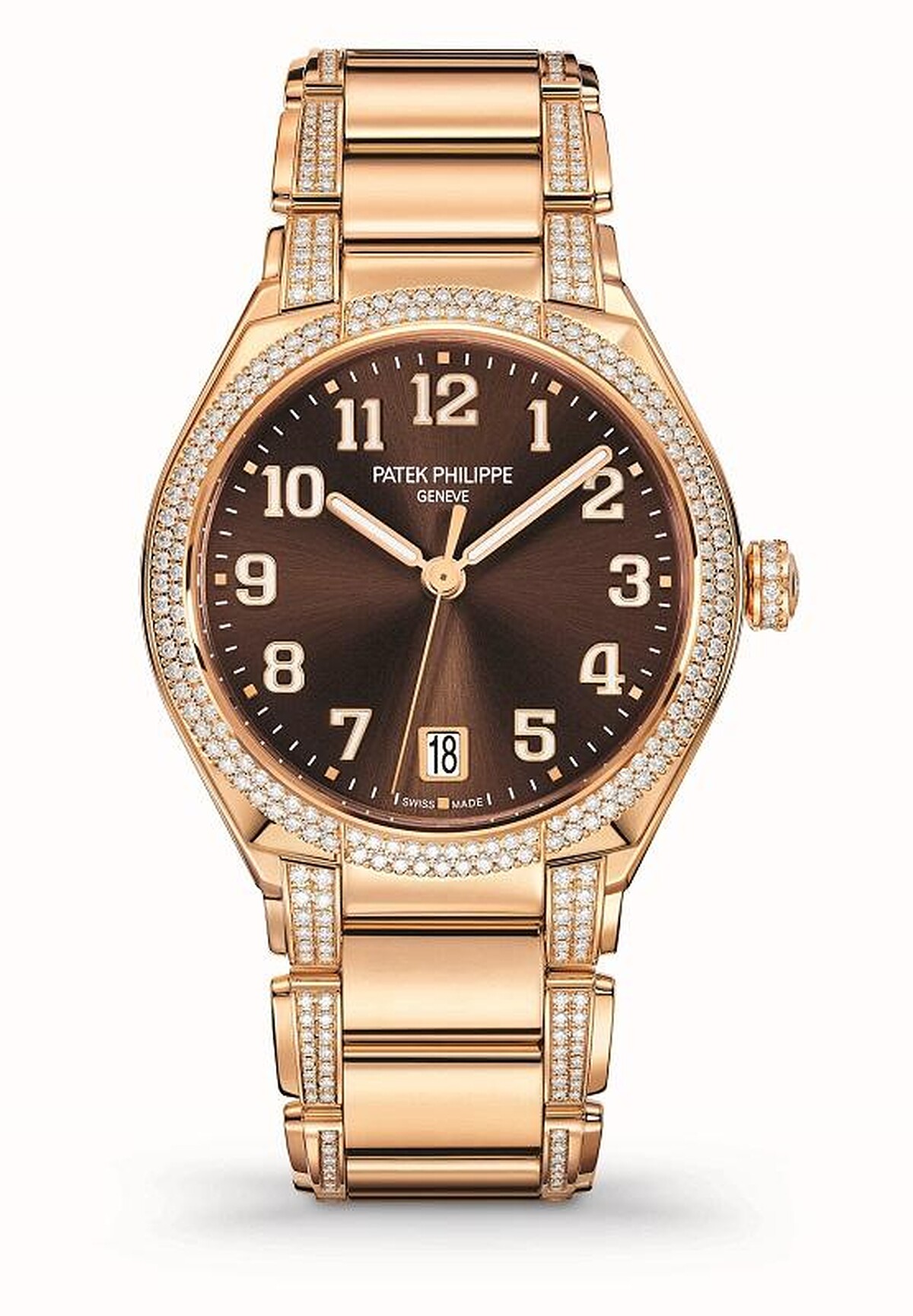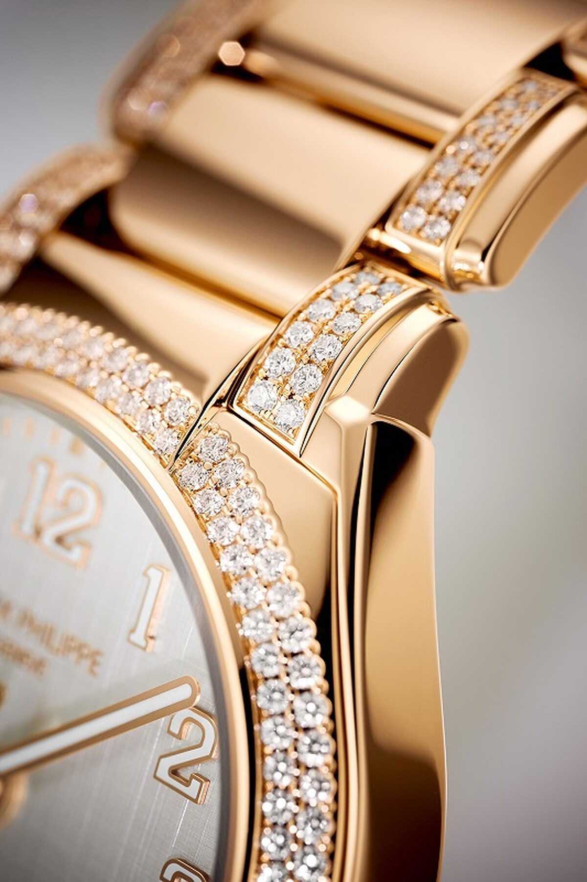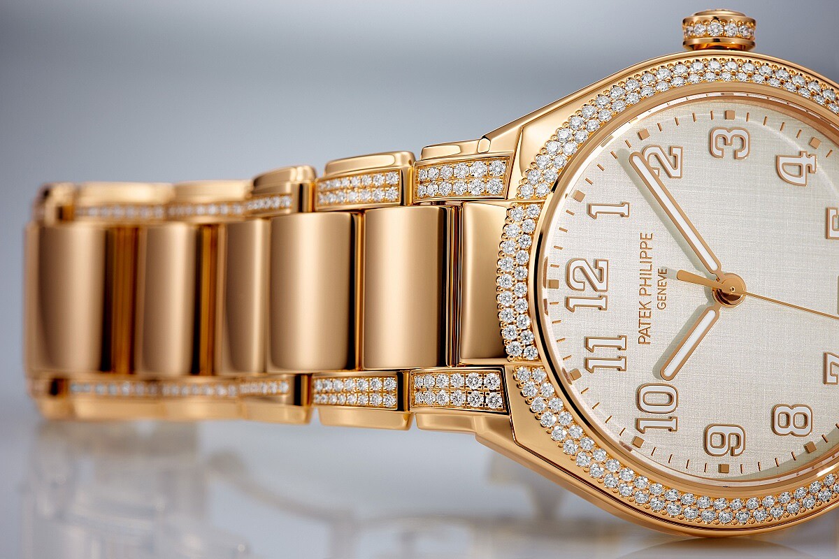延續Twenty~4腕錶簡約的經典風格,直徑36mm的圓形新錶殼,為了當代別具個性的女性所設計,百達翡麗將原有錶面上的羅馬數字時標換為阿拉伯數字,6點位置的日期顯示窗也示以玫瑰金外框、金質巴頓式夜光指針,更具現代感;而女性最在意的細節,品牌也展現了面面俱到的講究精神,妳可以看見鑲有208顆頂級Wesselton鑽石的錶環與錶耳,加上錶冠上的13顆鑽石、錶鏈上的248顆鑽石,搭配18K玫瑰金揉合出的細膩光耀,美到令人想要立刻擁有。