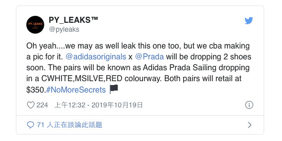 早在今年十月中,球鞋資訊平台PY_LEAKS™已在Twitter上對外宣布了adidas Originals將與Prada聯名推出兩雙限量款球鞋!並透露將會採用白、銀、紅作為球鞋的主色外,售價則落在美金$350的中價位,如此重磅又高規格的聯名,雖說在當時尚未受到雙品牌的證實,卻早已在網路上吵得沸沸揚揚。