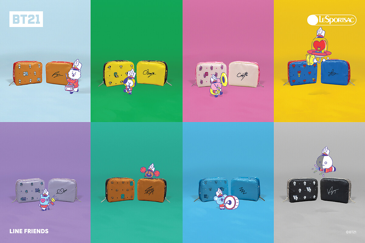 BT21 x LeSportsac聯名系列分成歡樂派對、可愛人物以及專屬化妝包等三大系列。歡樂派對系列可愛的BT21化身遊行樂隊,以夢幻粉色系作為主色調,加上充滿趣味的印花圖案。此外,還推出融入丹寧元素的拓印版,並推出全新後背束口袋包款。可愛人物則以黑色背景作為基底,並印上「Be Strong」、「HANDSOME」、「DANCING KING」等獨白。
