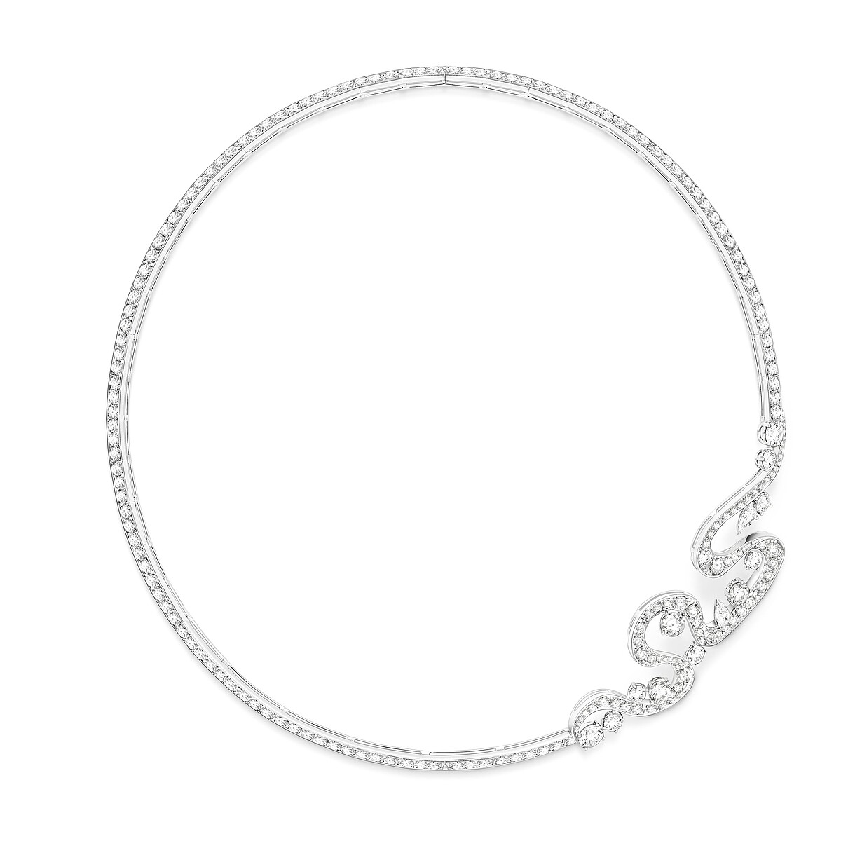 這件作品屬於「Desert Minerals 漠地之泉」主題,藉由濃郁的色澤、細緻繁複的線條與外型和精工細節,展現原始生命的純粹,這主題下多數的作品都以彩色寶石為主角,讓這條項鍊顯得相當脫俗、典雅,蜿蜒的線條與纖細的輪廓象徵沙漠裡的涓涓流水,像甘泉,為乾涸的大地帶來生命力,真的好美,不是嗎?