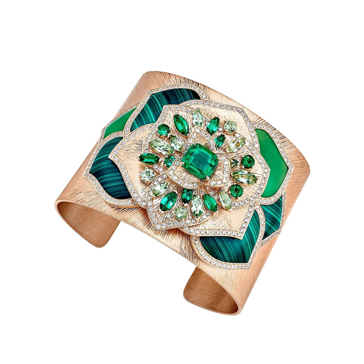 漠地裡的玫瑰,絕對是既嬌豔又堅毅不拔的,這件作品以各式綠色寶石如祖母綠、孔雀石、玉髓、碧璽取代刻板印象中玫瑰該有的紅,結合鑽石及 Piaget 伯爵最傲人的宮廷式雕刻工藝,讓這朵沙漠玫瑰超有個性,而多層次立體堆疊與流暢的花瓣線條,則讓作品看起來栩栩如生,十分精彩。