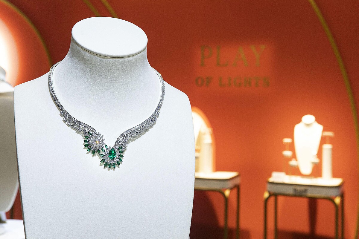 「Play of Lights 光之嬉戲」主題最搶眼的作品便屬這條項鍊了,創作靈感來自於太陽冉冉升起的瞬間,炙熱驕陽照應著廣大無垠的沙漠,強烈而眩目的景象以6.63克拉頂級艷彩黃鑽象徵太陽,環繞周圍的白鑽則是太陽耀眼的光芒。這件作品最珍貴之處還在於豔彩級黃鑽的取得十分不易,平均每一萬顆鑽石才有可能尋得一顆彩鑽,但所有黃鑽當中卻僅有6%的機會能成為色澤耀眼的艷彩等級,寶石大師甚至花費一年的時間才收集到最能與黃鑽相稱、最能代表黃金時刻的鑽石,珠寶工匠再花上將近600個小時,才得以完成件傑作。