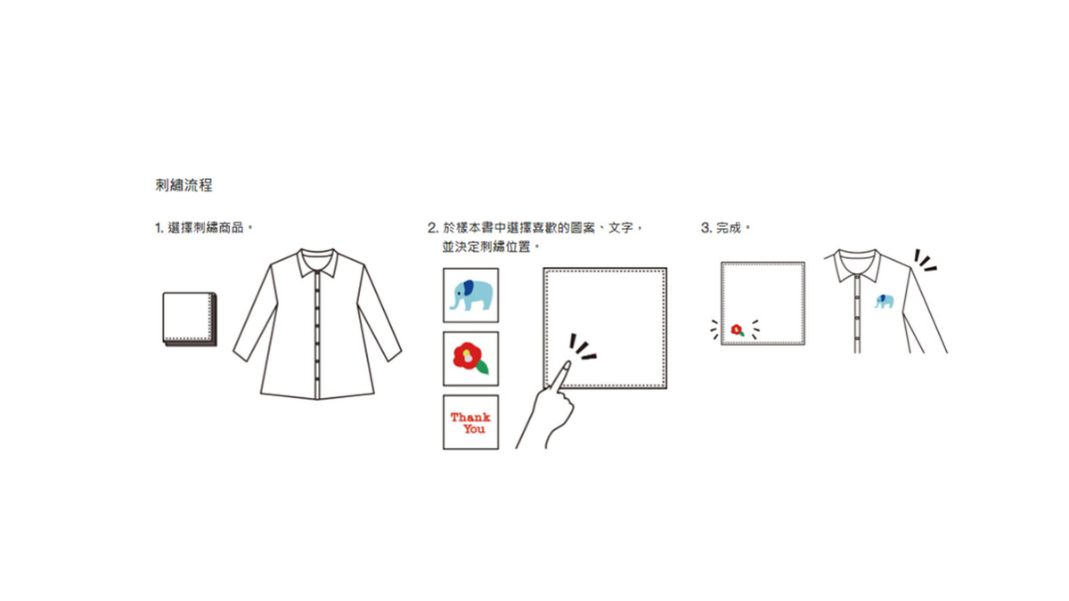 首先,挑選自己喜愛的服飾款式,記得必須當日購買的衣料品才能享有這項服務,接著到樣本書中選擇喜愛的圖案或文字,並決定想刺繡的位置,服務人員就會隨著需求幫你客製化服飾,客製化時間大約3-5個工作天。