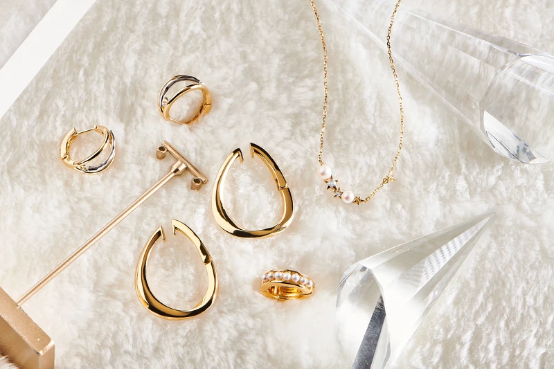 珍珠為知名的伊勢與四國的宇和島所生產的珍珠,搭配環狀與圓弧線條,融入10K金、鑲嵌天然鑽石、各種彩寶石及珍珠,既雅致又璀璨。