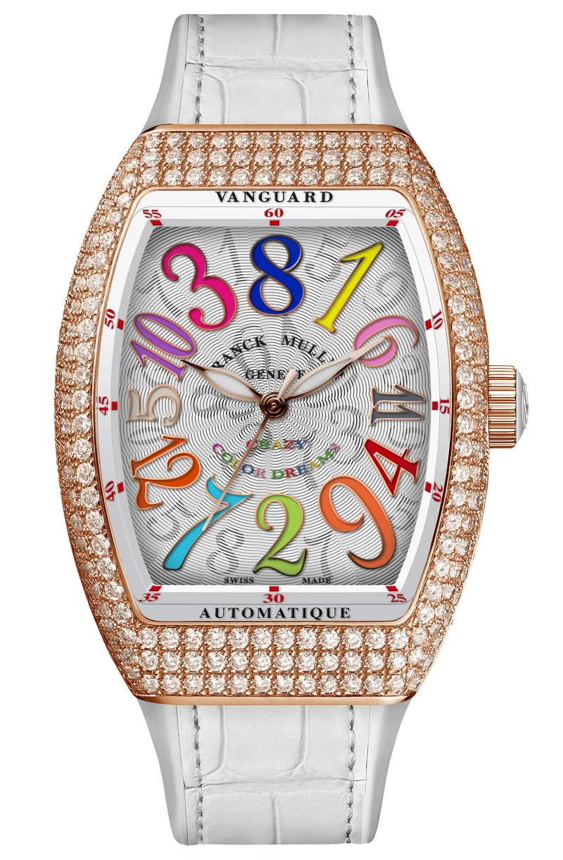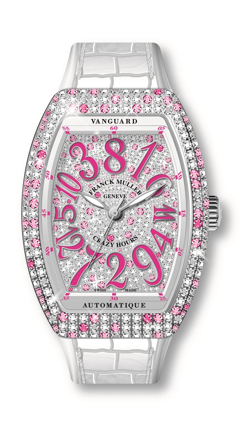 在今年的WPHH鐘錶展上,FRANCK MULLER推出全新 Vanguard Crazy Hours Lady系列,除了首度配備FRANCK MULLER另一款經典Vanguard錶殼,錶盤與錶殼鑲嵌的頂級鑽石及玫瑰寶石,與俏麗的彩色浮雕數字完美結合,外型典雅、氣質瑰麗,更能展現女人特質的設計,讓許多女性鐘錶收藏家為之心動。