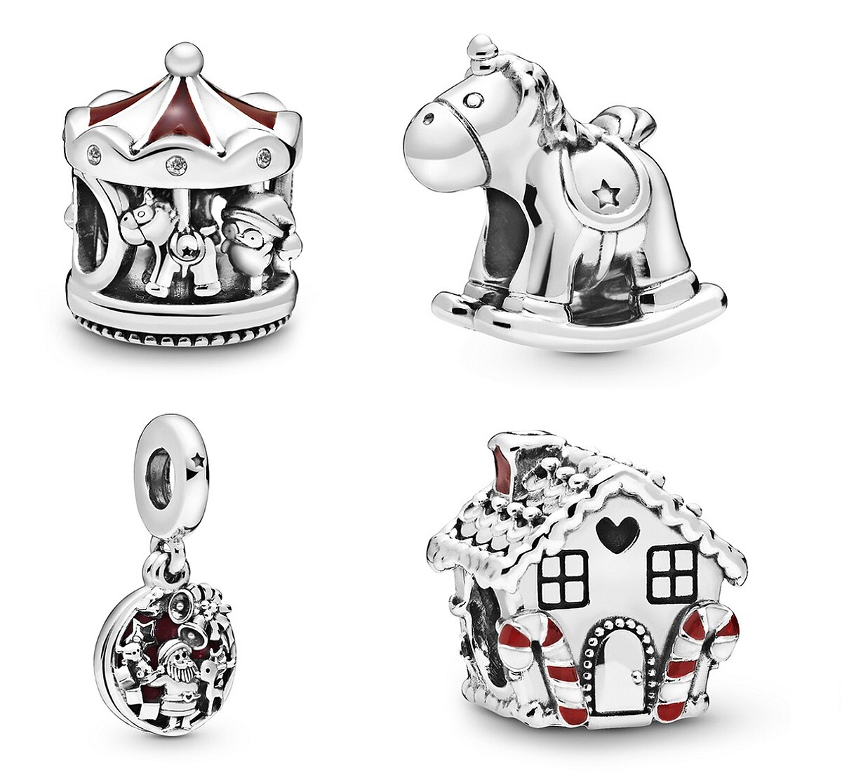 (左上)樂園旋轉木馬925銀琺瑯串飾、(右上)童趣木馬925銀串飾、(左下)聖誕傳說925銀琺瑯吊飾、(右下)薑餅屋925銀琺瑯串飾