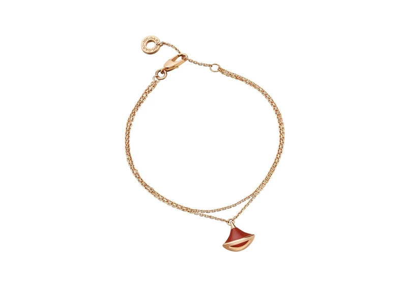 BVLGARI 的 Divas’ Dream系列以精緻扇形曲線做為設計標誌,靈感源自羅馬卡拉卡拉浴場馬賽克地磚圖騰,搭配18K玫瑰金細鍊,氣質十分優雅、大方,而紅玉髓象徵活力與生命力,同時還有健康的寓意,滿滿的正能量做為禮物再適合不過了!同系列還有綠松石及珍珠母貝款。