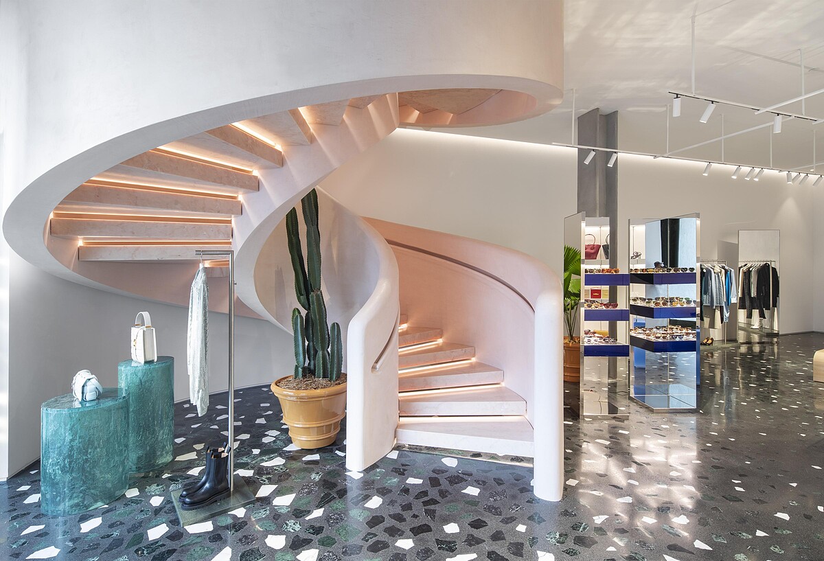 一樓女裝將飾品陳列在BOTTEGA藍妝點過的桌面,服飾則懸掛於大理石厚板架上,延著粉色石灰X大理石的迴旋階梯而上的二樓,則是男裝區域,擁有溫暖的再生木質地板、濃郁赭黃色皮革長凳、透過Murano玻璃與藍色桌邊設計,強調出大膽的黃橘色感,一氣呵成且連貫的寧靜美麗色彩,搭配上透過玻璃映射而入的溫暖明快日光,精湛呈現出邁阿密與Daniel Lee的BOTTEGA VENETA邂逅。