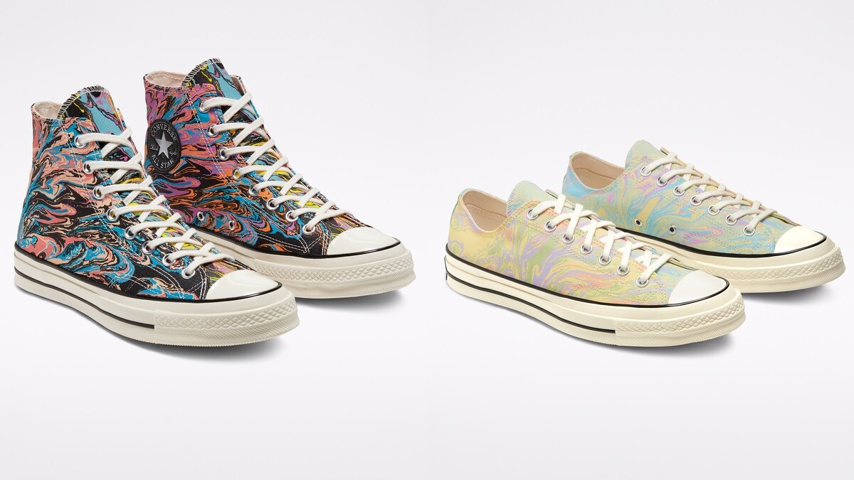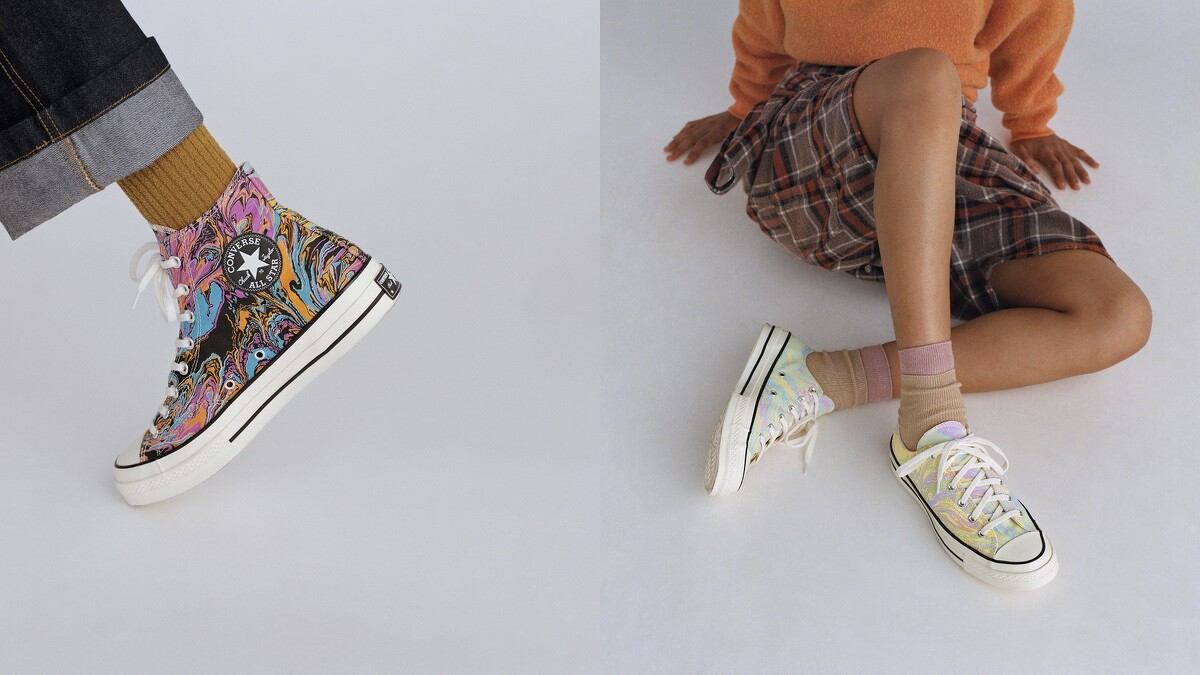 另外,Converse從日本手工浸染工藝中汲取靈感,在人氣帆布鞋Chuck 70上創造鮮豔迷幻的大理石配色,Marble系列展現大膽、活潑的風格,並致敬無畏的態度,提供高筒與低筒兩種鞋款選擇。