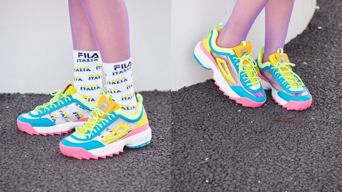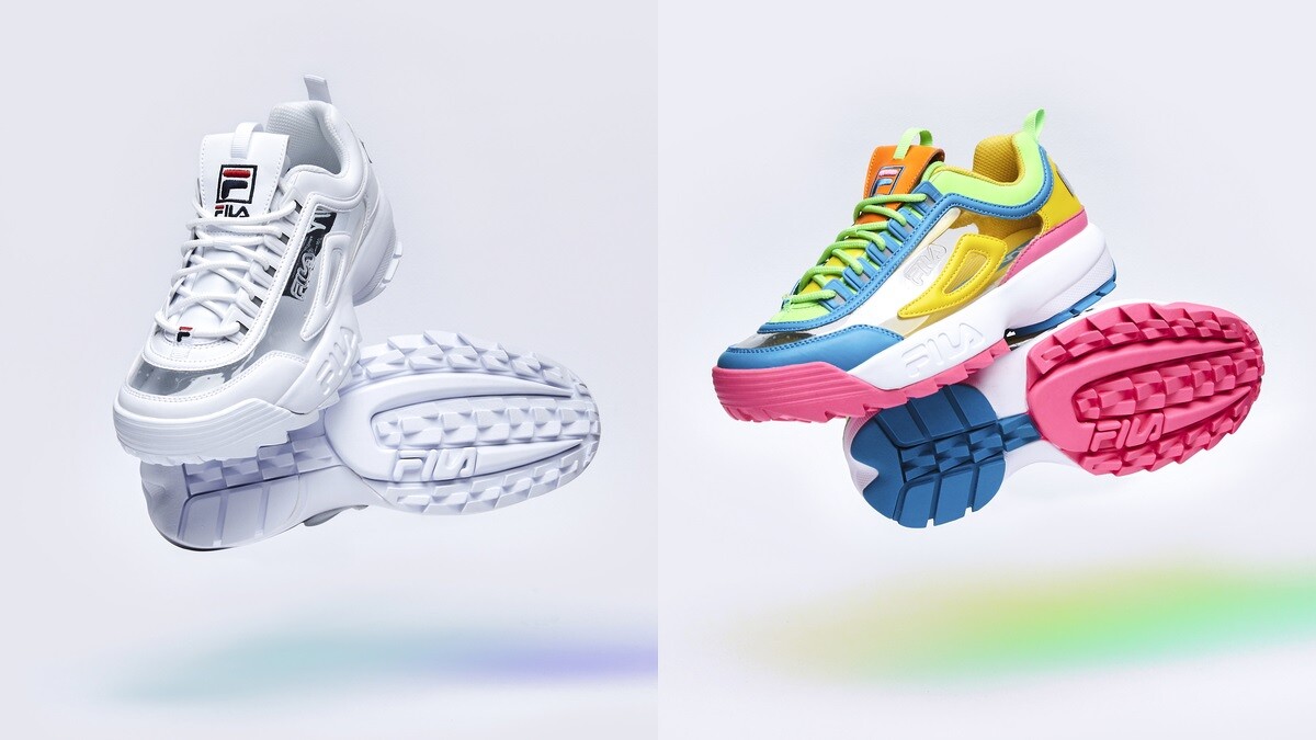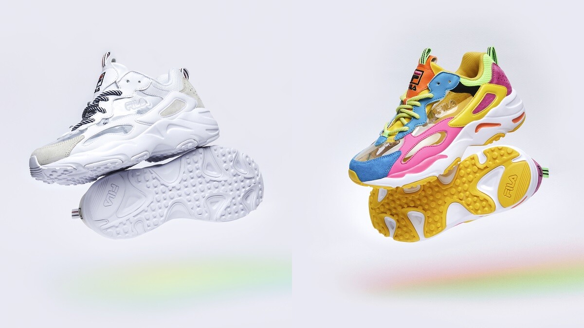 不只這樣,FILA熱賣鞋款之一RAY TRACER NAYKID也有全新配色釋出,以地圖描繪為設計概念,融入90年代的輝煌榮耀,帶有更厚實的復古韻味,分別推出透明白色、繽紛彩色兩種選擇。