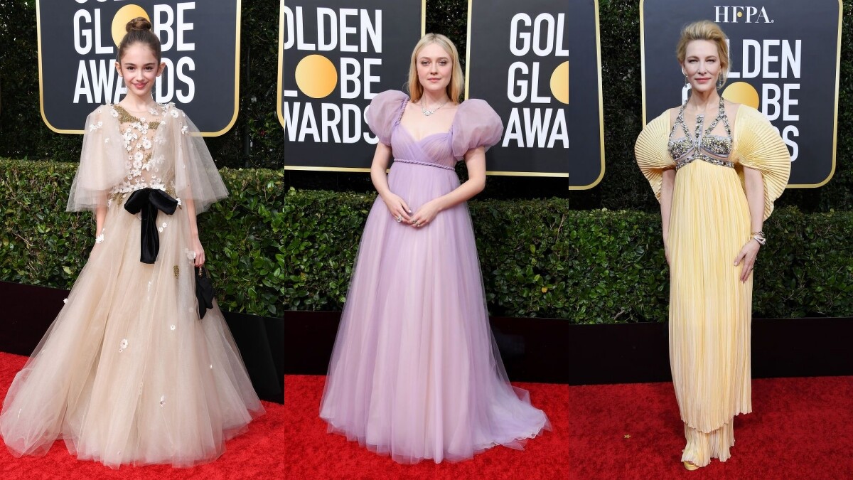 禮服的袖子設計也是一大學問!年僅10歲的美國童星Julia Butters在她人生首次出席的金球獎紅毯上,身著了一襲飄飄然的精靈系禮服,除了有層層透紗,傘狀的袖形設計更添入輕盈感,當然,上頭繡以的花朵也是整體的夢幻加持元素。同樣童星出身的Dakota Fanning,這回穿上了紫藤花色的宮廷澎袖禮服,宛如小公主般優雅迷人。而有著精靈女王之稱的Cate Blanchett,選擇了一件充滿設計感的褶襇禮服,搭配胸前閃亮亮的珠飾點綴,無疑彰顯女王氣息。