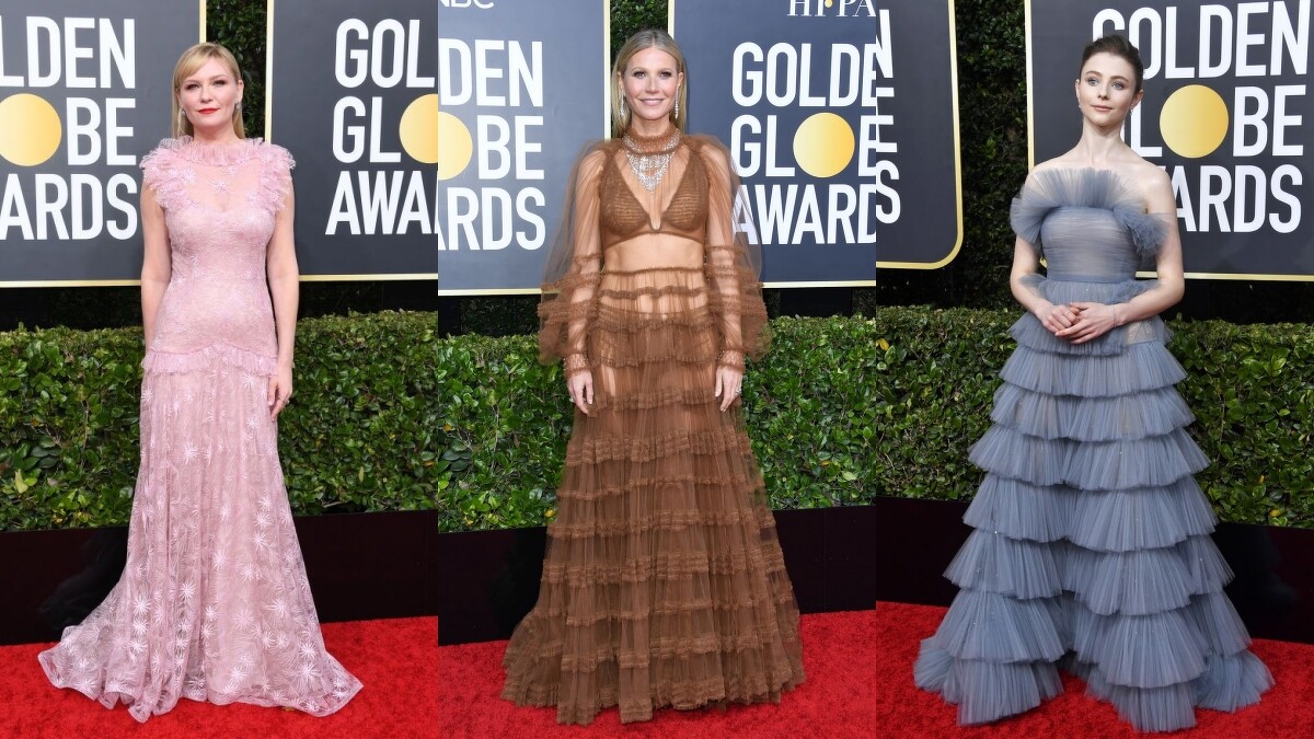 透紗依舊是女星們的心頭愛!Kirsten Dunst以一襲褶襇飾邊領的淡粉色透紗禮服現身紅毯,仔細看,裙擺上的星星圖印更替造型注入夢幻質感。 Gwyneth Paltrow則以Fendi的咖啡色層疊透紗禮服襯托優美且別具女性沈穩氣息的一面,然而Gwyneth Paltrow也發揮玩味巧思,將寶格麗的珠寶項鍊穿戴於禮服內,如此造型手法巧妙地替珠寶罩上一層朦朧仙氣。Thomasin McKenzie的夜幕藍公主紗裙和她雙眸的顏色恰巧呼應著,說是精靈王國的仙子也不為過。