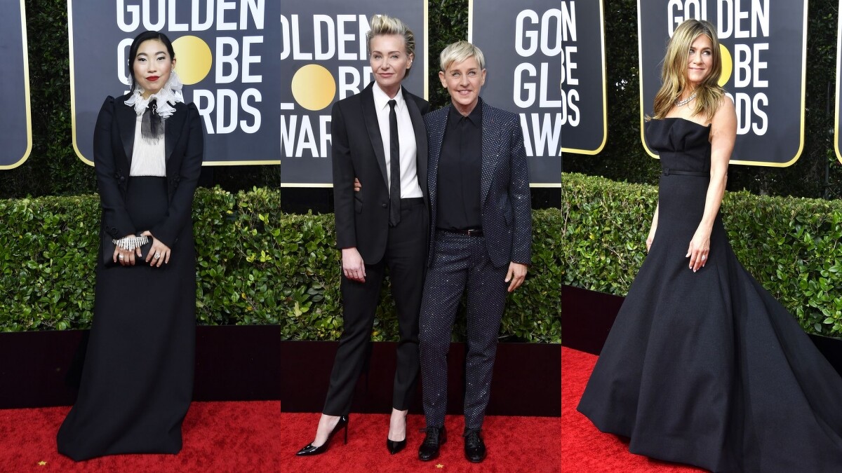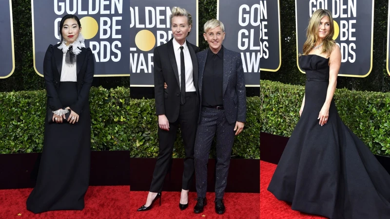 但到頭來,黑色仍然是從未缺席的顏色選。亞裔女星Awkwafina這回以公爵夫人的褶襇飾邊高領襯衫搭配黑色長裙西裝裝束,展現氣質端莊的面向。Ellen DeGeneres和Portia de Rossi這對佳偶則紛紛穿上CELINE的西裝裝束:Portia de Rossi的黑白西裝造型搭上尖頭高跟鞋,帥氣又帶霸氣女人味; Ellen DeGeneres則選擇以飾滿水鑽的西裝華麗出場。Jennifer Aniston這襲大器又簡約的禮服則來自Dior的高級訂製系列,簡單和鑽石珠寶搭配就顯得超級貴氣動人。