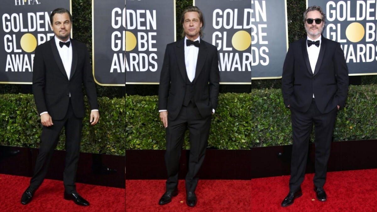 在欣賞完以上多位女嘉賓的紅毯造型後,最後即將介紹的這三位男星絕對也是此次金球獎受矚目的焦點人物!因電影《從前,有個好萊塢Once Upon a Time in Hollywood》榮獲喜劇類最佳男主角提名的Leo DiCaprio 和男配角Brad Pitt,紛紛以白襯衫+黑色西裝裝束+領結的造型亮相,另外本屆的影帝+新一代小丑 Joaquin Phoenix也不謀而合地以相似造型現身,但當然,各自散發出的氣場魅力依舊無人能匹配。