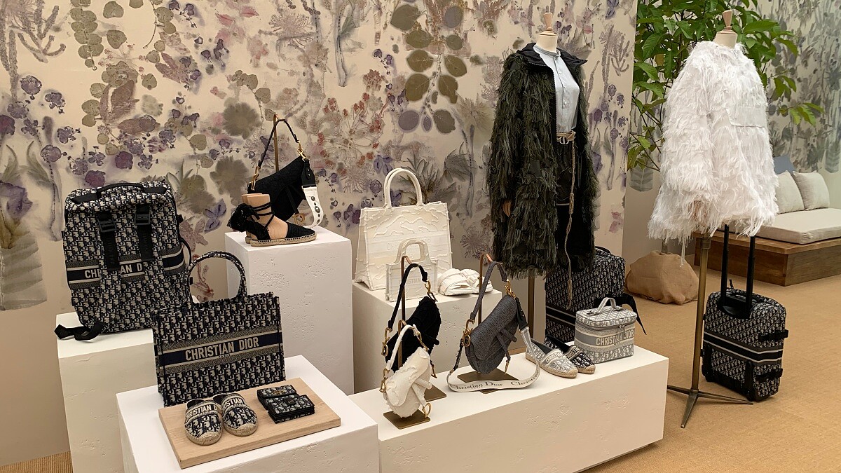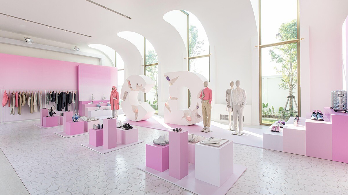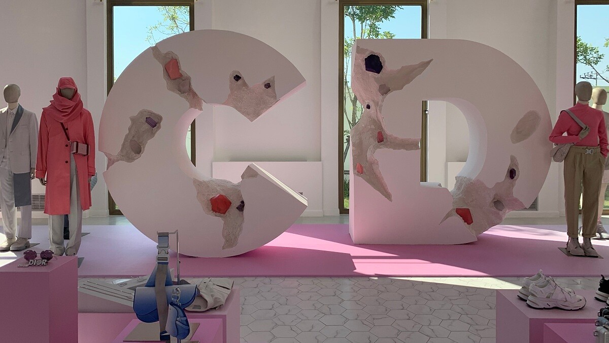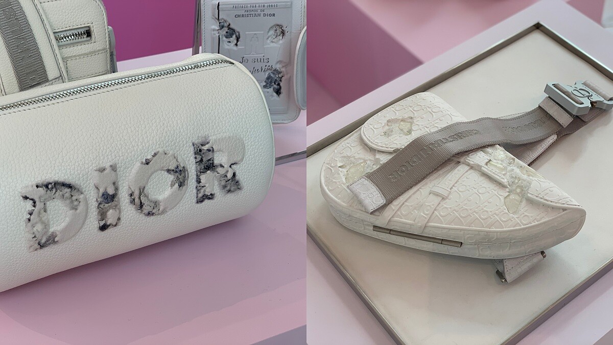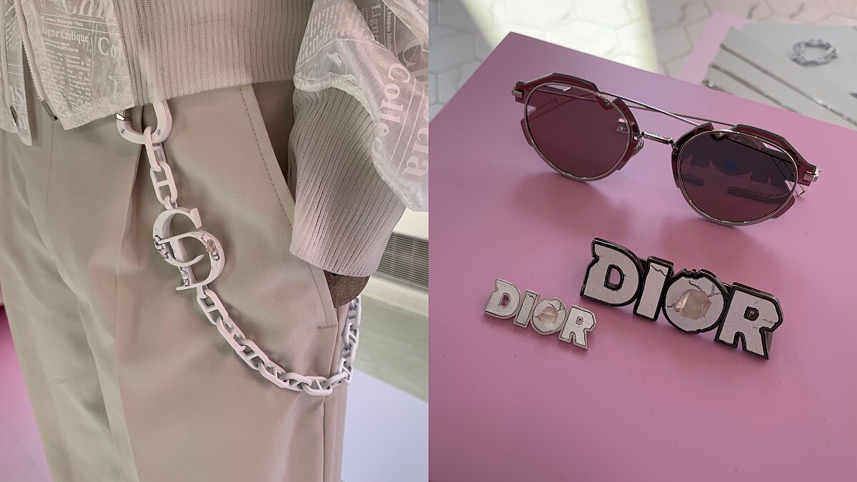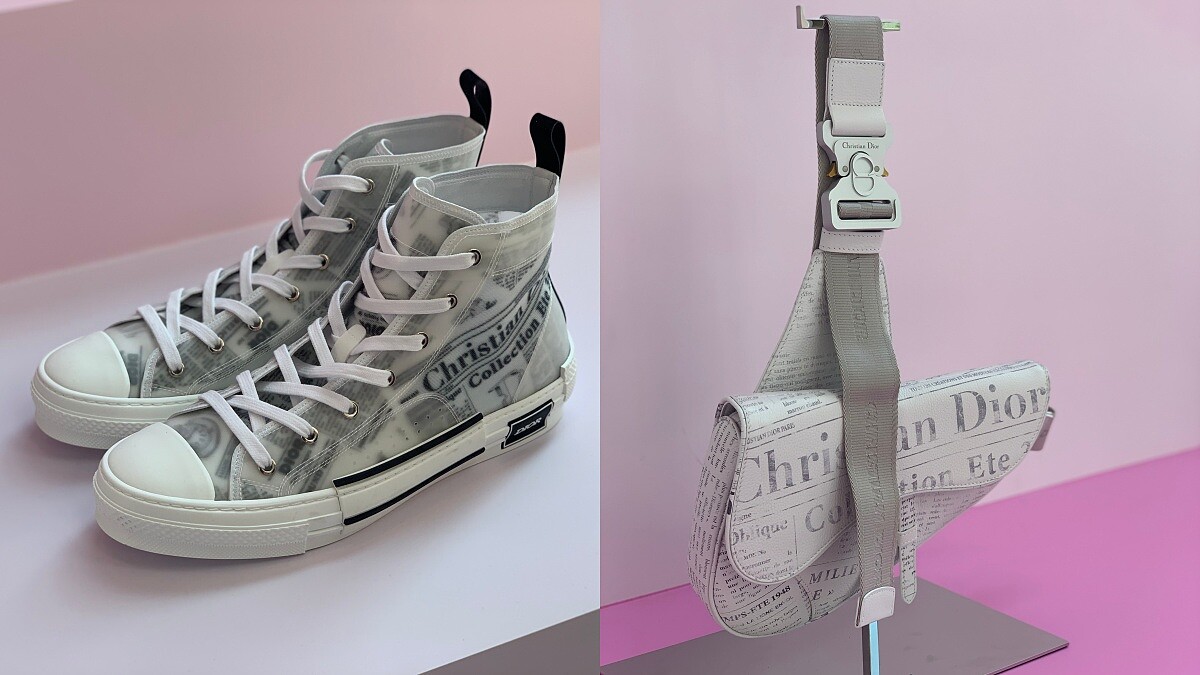 走進另一頭的男裝區,品牌大寫CD佇立於會場正中間,上頭有如古代遺物的風化現象,正呼應2020春夏系列主題「未來遺風」,對藝術一向有著高度興趣的男裝創意總監Kim Jones,2020春夏系列找上美國當代藝術家Daniel Arsham合作,以人們在未來挖掘出迪奧精品為靈感,結合考古、雕塑及建築等概念,並注入粉紅、天藍等春夏色系。值得一提的是,Daniel Arsham將2000年春夏高訂系列John Galliano所設計的報紙印花journaux重新演繹,為經典商品馬鞍包、帆布鞋換上全新面貌。
