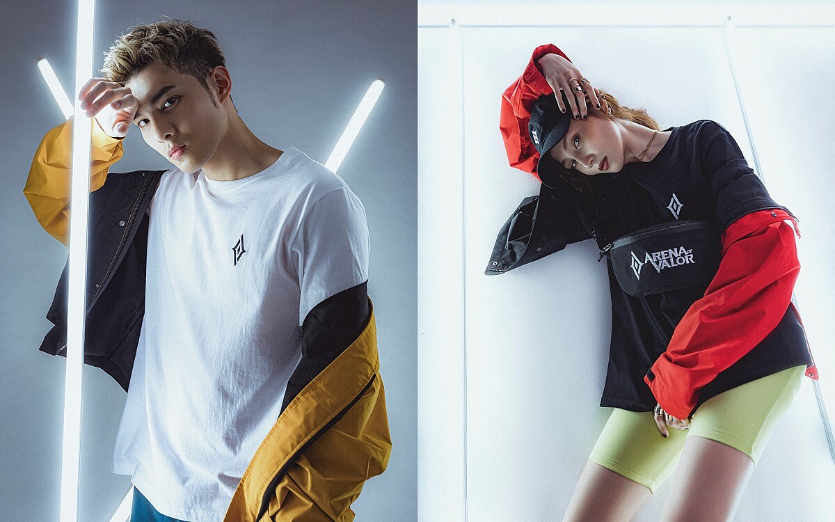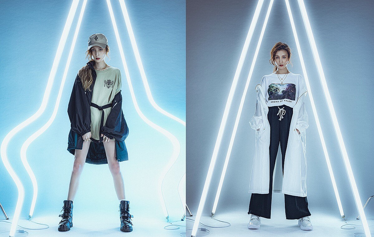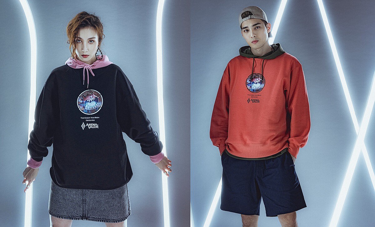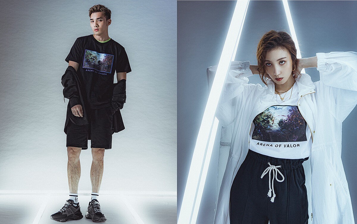女:男裝登山外套,NT1,490、男裝印花T恤ARENA OF VALOR,NT390、迷你包ARENA OF VALOR,NT590、鴨舌帽ARENA OF VALOR,NT390、女裝單車短褲,NT390。