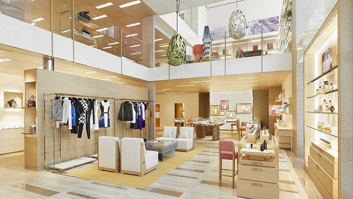 一樓展示女性配件系列,而中間夾層樓層則專門呈現行李箱和旅行藝術系列,三樓為路易威登女裝藝術總監Nicolas Ghesquière設計的全系列女裝服飾和配件,第四層樓是路易威登男裝藝術總監Virgil Abloh設計作品的歸屬,值得一提的是為於頂樓的Louis Vuitton第一家咖啡店「Le Café V」,品牌特地攜手有日本料理鐵人之稱的須賀洋介,並為咖啡店訂製專屬菜單。