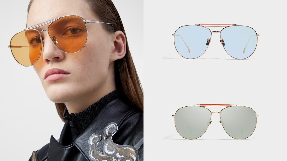 淺色的糖果系鏡片還有此系列,飛行員太陽眼鏡的設計不敗,品牌特地在頂樑部分加入細節,使用灰色和紅色點綴,可使整體造型更亮眼,且採用輕量的鈦金屬鏡框,配戴長時間也不成問題。推出四種不同色系的鏡片選擇。
